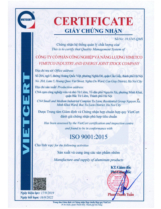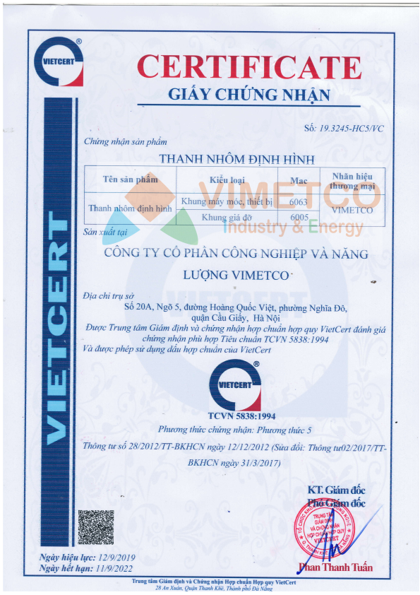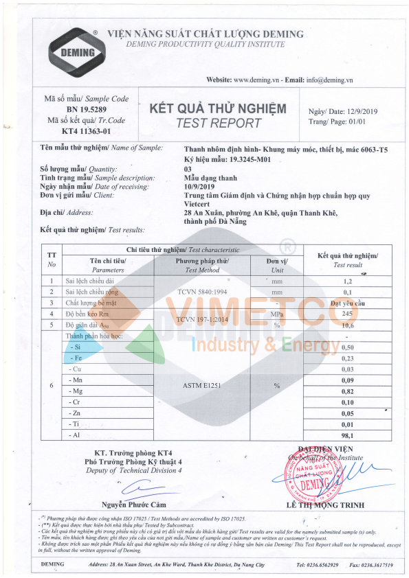 | Chứng nhận ISO 9001-2015 | Bảng Test mác nhôm A6005-T6 | Chứng nhận vật liệu sử dụng | Bảng Test mác nhôm A6063-T5 |