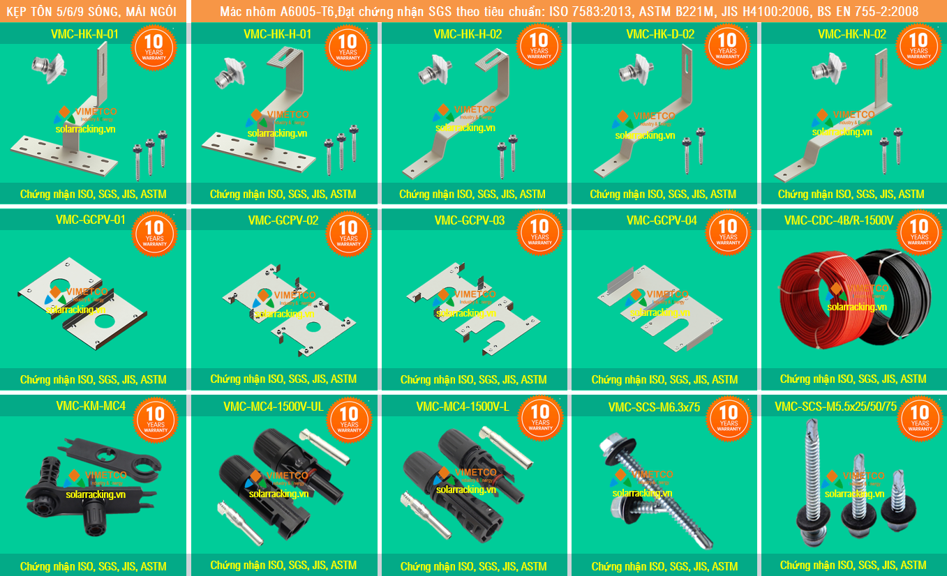 Hầu hết các thành phần phụ kiện lắp đặt hệ thống Pin mặt trời Vimetco Solar được làm bằng nhôm anodized AL6005 và SUS304. Với việc không ngừng thiết kế và sáng tạo ra các kết cấu tối ưu, lắp ghép linh hoạt mang tới cho khách hàng sự hài lòng khi sử dụng, Phụ kiện do Vimetco Solar sản xuất có thể được áp dụng cho hệ thống điện mặt trời lắp đặt trên mái nhà phổ biến và dưới mặt đất. Phụ kiện lắp đặt pin mặt trời của Vimetco Solar đa dạng Bao gồm các loại thanh ray ( Solar Rail ), các loại kẹp tấm Pin ( Mid Clamp, End Clamp), các bích tiếp đất, các loại giải pháp ép cọc, móng vít cho hệ pin mặt trời lắp dưới mặt đất, Kẹp cáp, Chân gá chữ L, chân gá mái ngói, giắc cắm MC chuyên dụng cho hệ thống Pin mặt trời .vv...