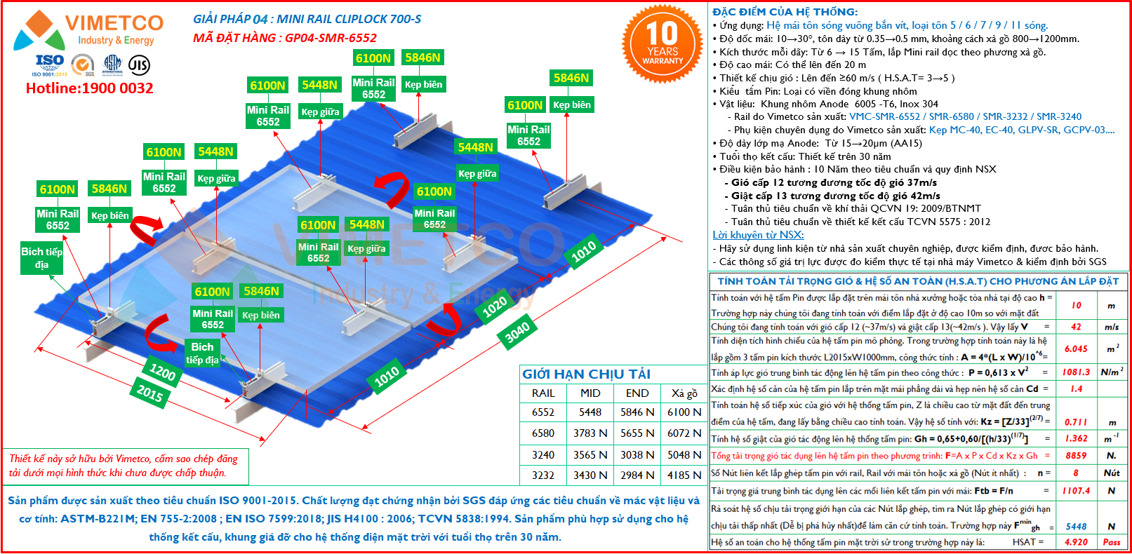 • Kích thước mỗi dãy : Từ 6 → 15 Tấm, lắp Mini rail Z50x100xL200 dọc theo phương xà gồ.
