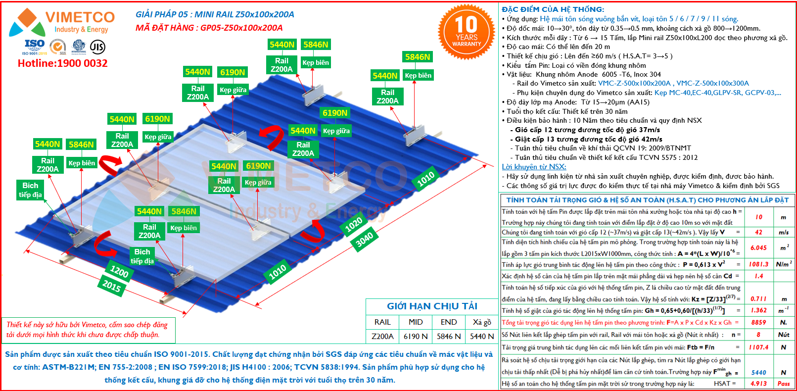 • Kích thước mỗi dãy : Từ 6 → 15 Tấm, lắp Mini rail Z50x100xL200 dọc theo phương xà gồ.