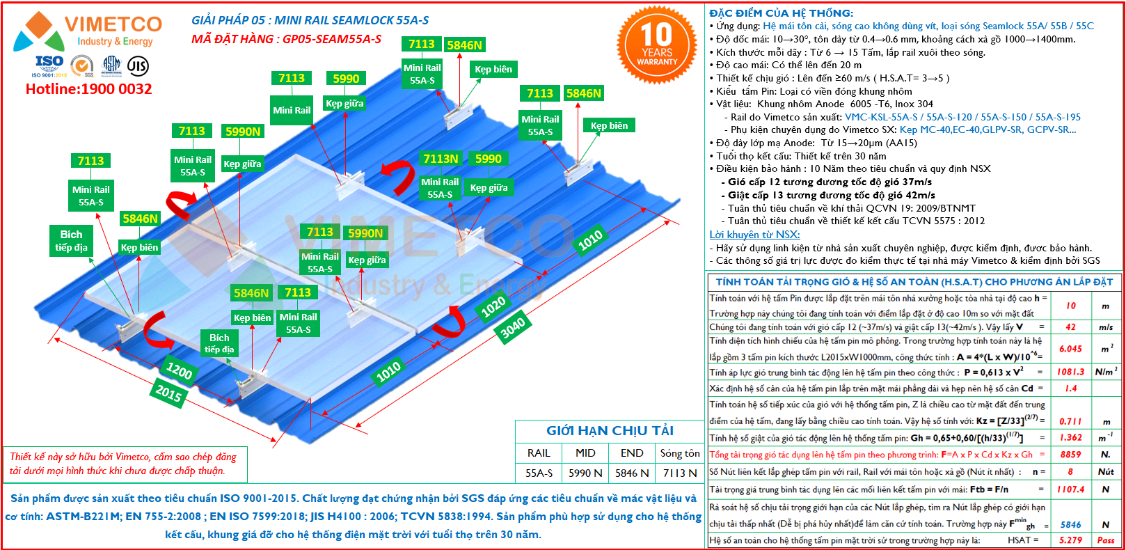 • Thiết kế chịu gió : Lên đến ≥60 m/s (H.S.A.T= 2.0)